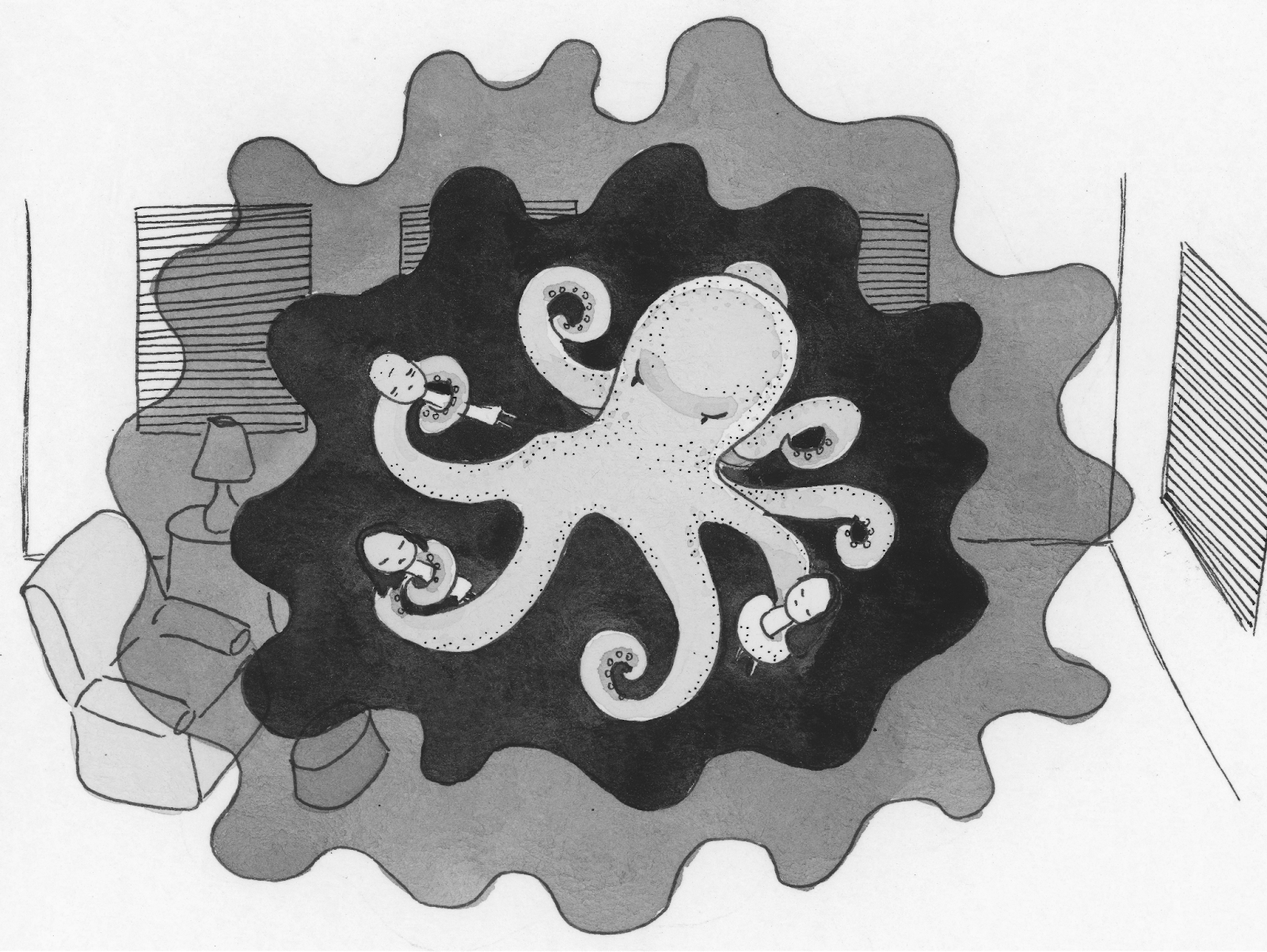Now I was standing in line at the register, holding four guardian angel candles. I knew how stupid it was, burning these candles as if he were lost and they would help him find us. The woman in the checkout wouldn’t know what kind of hell was washing over my life. It may as well have been a black, poisonous ink of a mammoth evil octopus, engulfing every square inch of our home.